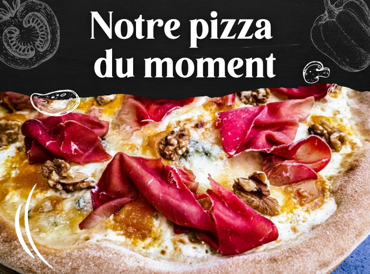 Crème fraîche, crème de potimarron, Gorgonzola , Mozzarella fior di latte. Après cuisson : bresaola, cerneaux de noix.