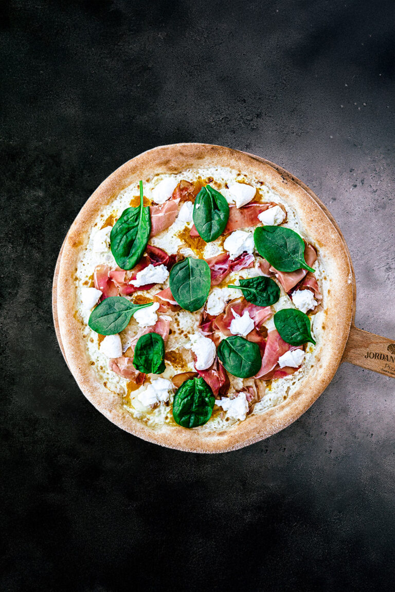 Crème fraîche, jambon blanc artisanal*, crème de truffe noire et champignons. Après cuisson : Mozzarella di Bufala, pousses d’épinards, huile de truffe.