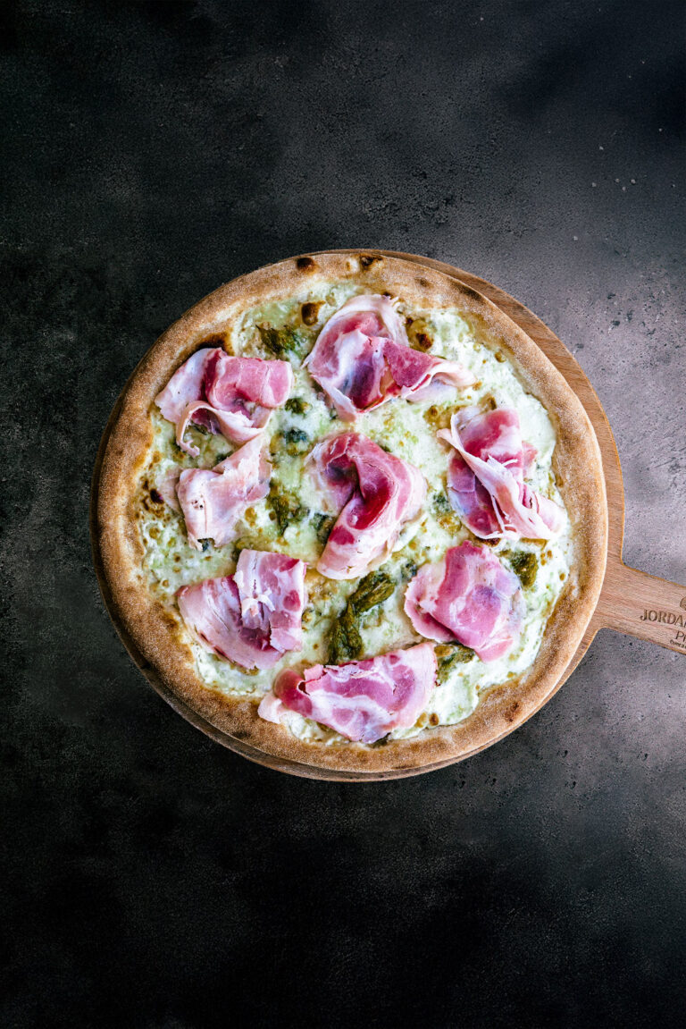 Crème fraîche, jambon blanc artisanal*, champignons, Mozzarella fior di latte. Après cuisson : Ricotta al basilico, pesto alla Genovese.