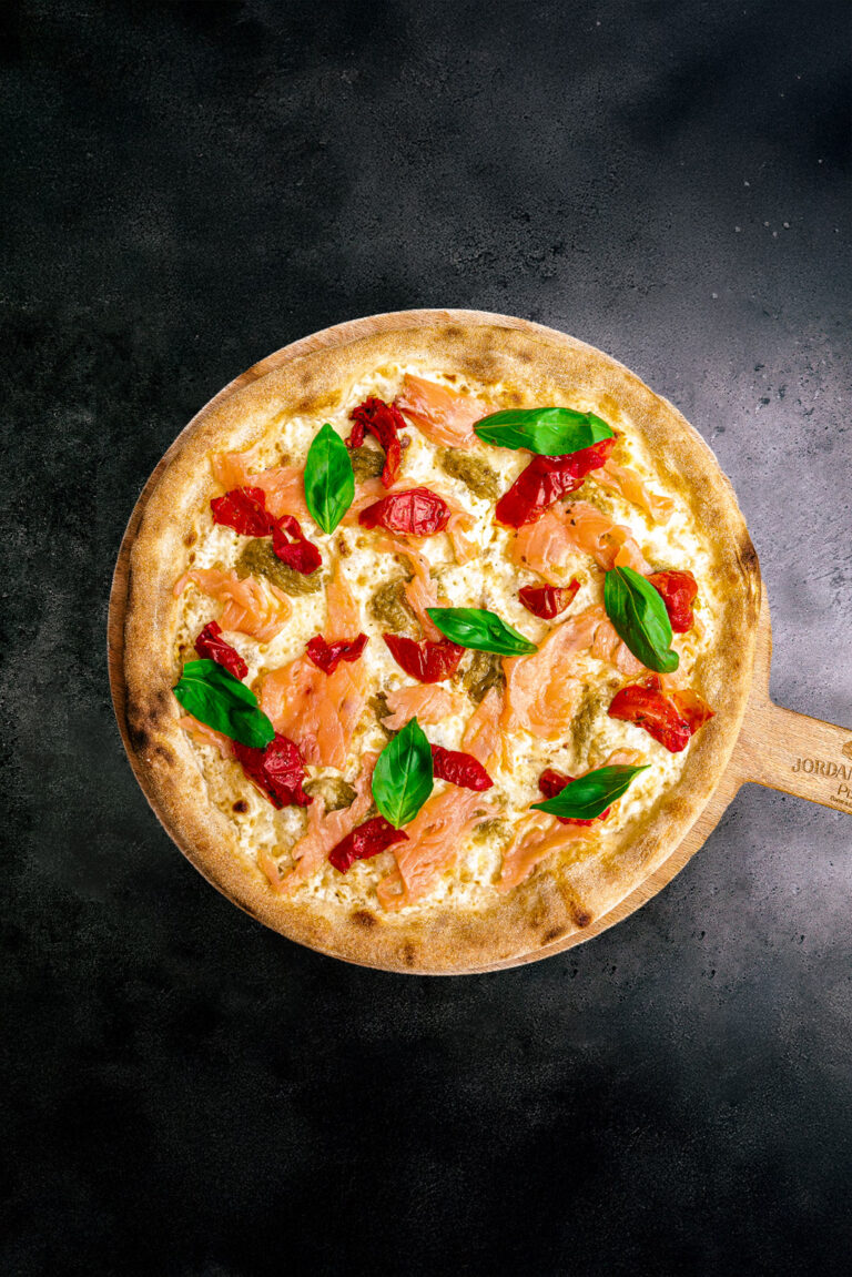 Un délicieux équilibre entre terre et mer : une base de crème fraîche légère, du saumon fumé savoureux, de la Burrata fondante, du pesto alla Genovese, des tomates semi-séchées et de la roquette fraîche. Un filet de jus de citron vient relever cette création, idéale pour les amateurs de légèreté et de finesse