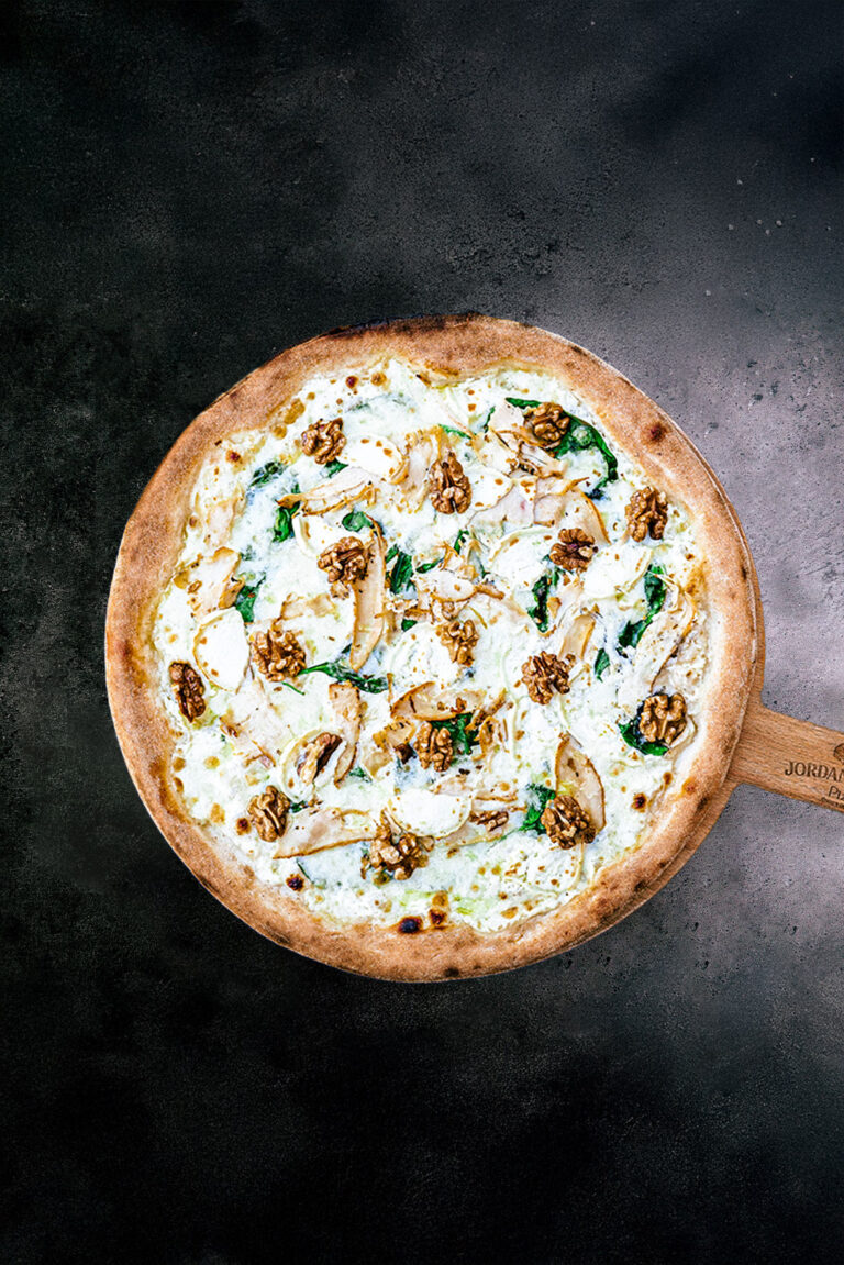Crème fraîche, pousses d’épinards, Mozzarella fior di latte, poulet, Chèvre. Après cuisson : cerneaux de noix, huile de noix.