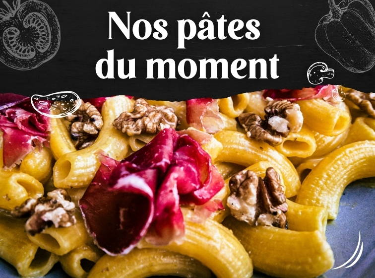 Rigatoni (pâtes fraîches maison aux oeufs), crème de potimarron, Gorgonzola , Mozzarella fior di latte, bresaola, cerneaux de noix.